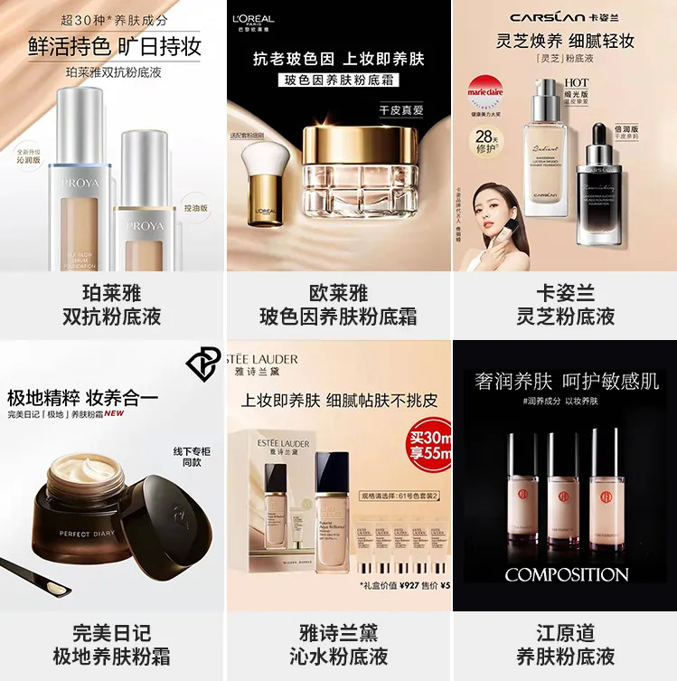 其二,通過(guò)成分或配方的設(shè)計(jì),往“養(yǎng)膚”等具有護(hù)膚概念的方向靠攏。比如很多品牌在宣傳粉底液時(shí)都會(huì)采用“上妝即養(yǎng)膚”“妝養(yǎng)合一”等字句。對(duì)于通常只起到遮蓋作用的彩妝產(chǎn)品,這類粉底液相當(dāng)于在遮蓋、均勻膚色等作用外,還在一定程度上增加了“養(yǎng)膚”的附加值。