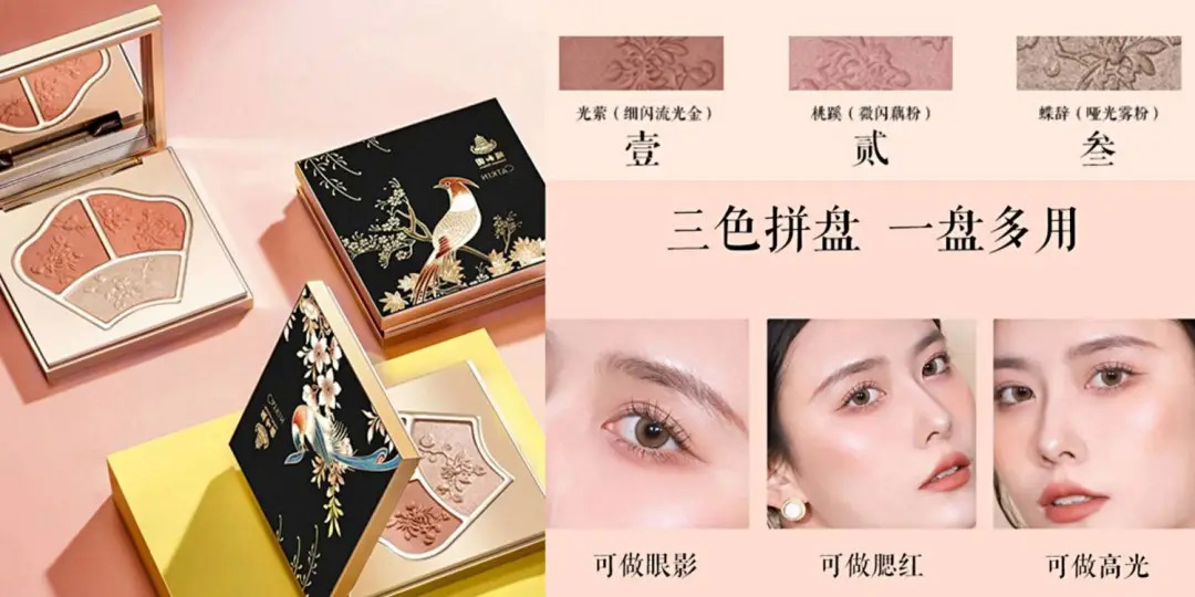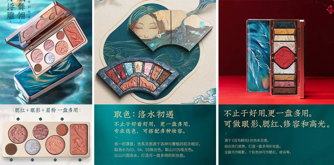 花西子的七色青鸞浮雕彩妝盤、牡丹鏤月浮雕彩妝盤、百鳥(niǎo)朝鳳浮雕彩妝盤(下圖從左至右)都將“一盤多用”作為產(chǎn)品的優(yōu)勢(shì)之一。