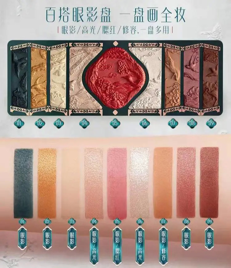 以百鳥(niǎo)朝鳳盤為例,這個(gè)盤整體來(lái)說(shuō)是一個(gè)眼影盤,但其中,05號(hào)色(鳳凰翎)在眼影之外,可以同時(shí)作為腮紅使用,而04、06號(hào)色可以作為高光,07號(hào)色則可作為修容。