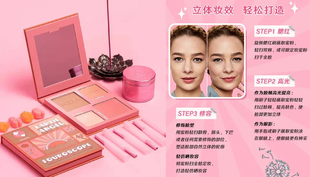 在單色多用的產(chǎn)品中,能進(jìn)行功能融合的品類主要有腮紅、口紅、修容和眼影。其中,口紅和腮紅都是以紅色或粉色系為主的品類,在質(zhì)地上,也會(huì)有水狀和泥/膏狀等重合的部分。因此,“唇頰兩用”單品是最常見(jiàn)的多功能彩妝單品。