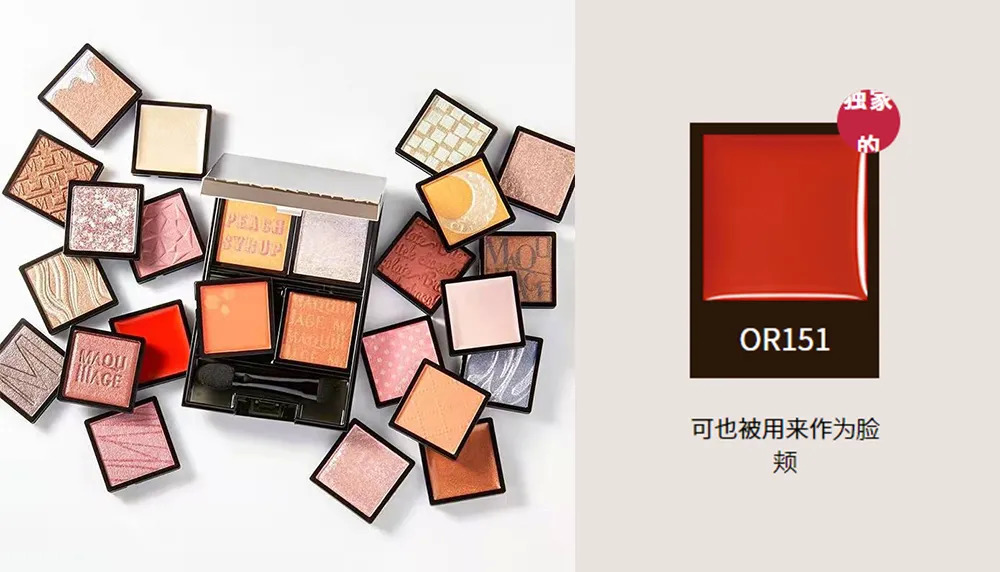 Maquillage的眼影系列,根據(jù)有無(wú)珠光和珠光顆粒大小可以分為4個(gè)質(zhì)地、25個(gè)顏色,相較于hourglass和make up forever,在壓花、色彩設(shè)計(jì)上更為精致。其中,OR151號(hào)色為奶油質(zhì)地,可作為腮紅使用。目前,定制空盒只有四色一種規(guī)格。
