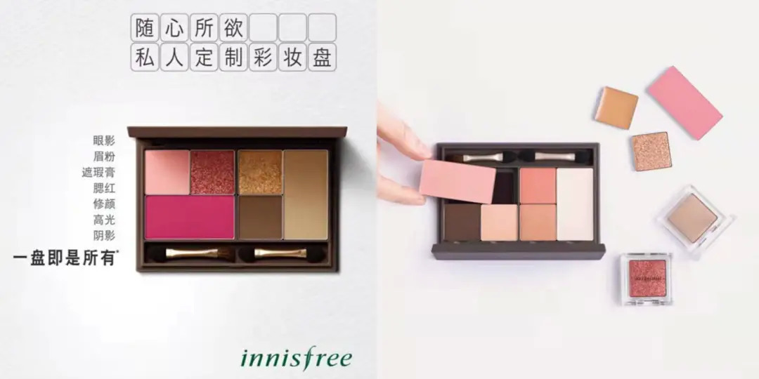 悅詩(shī)風(fēng)吟在2018年推出的“私人定制彩妝盤”活動(dòng)中,也著重打造了一款可以將眼影、眉粉、遮瑕膏、腮紅、高光、陰影等品類自由拼配的彩妝盤。這個(gè)系列中,可供組合的顏色共140種,且有粉狀、膏狀、帶閃、不帶閃等多種質(zhì)地,匹配四色、八色和十八色三種不同size的彩妝盒。