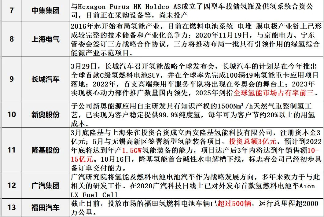 此外,去年上汽集團(tuán)旗下捷氫科技新園區(qū)建成投產(chǎn),成為國(guó)內(nèi)首個(gè)全面覆蓋膜電極、電堆、電池系統(tǒng)的車(chē)規(guī)級(jí)氫燃料電池制造基地,可形成萬(wàn)臺(tái)套燃料電池電堆的年產(chǎn)規(guī)模。更多企業(yè)的布局請(qǐng)看下表: