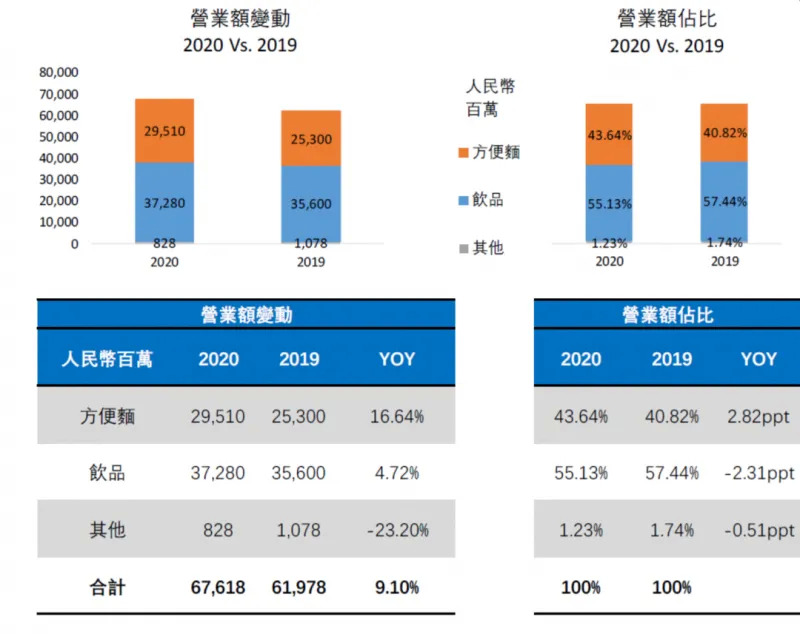 康師傅2019年與2020年銷量對比,圖/康師傅財報