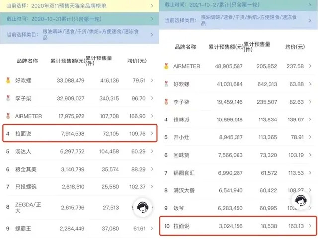 據(jù)悉,拉面說在經(jīng)歷一波快速增長后,2021年下半年開始經(jīng)歷下滑。在雙11的首輪預(yù)售中,銷售額相比去年接近腰斬,而在速食領(lǐng)域的排名也從去年的第四下降到第十。拉面說把價格做到了20元+,但在營銷之后,也遭遇了口碑下降,復(fù)購難的問題。