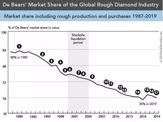 2016年戴比爾斯的市場(chǎng)份額減少到35%