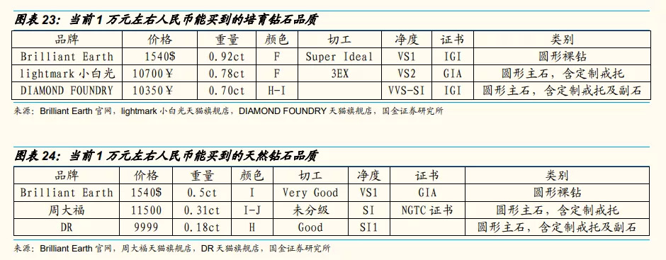 國(guó)金證券對(duì)比了零售市場(chǎng)天然鉆石與培育鉆石的價(jià)格