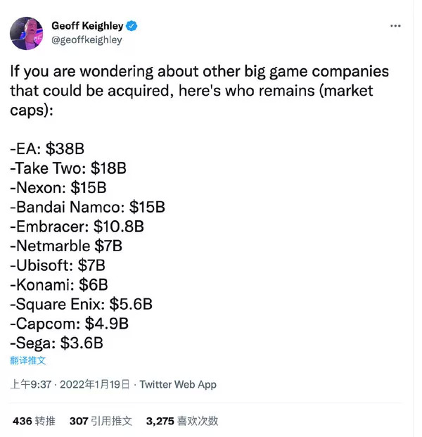 即使我們都知道,在收購(gòu)動(dòng)視暴雪后微軟勢(shì)必需要不少時(shí)間去消化整合,短期內(nèi)不會(huì)再有類似的重大收購(gòu)事件,但吃瓜網(wǎng)友們的想象力是無(wú)窮的,他們已經(jīng)開(kāi)始猜測(cè)微軟下一步的目標(biāo)會(huì)是誰(shuí)了,例如TGA創(chuàng)始人杰夫·吉司利就發(fā)布推文,分享下一個(gè)可能被收購(gòu)的游戲公司以及它們的市值,共計(jì)11家公司,總市值1159億美金。