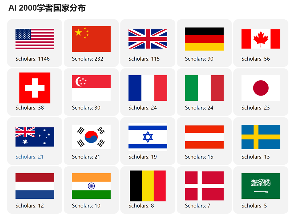 具體而言,美國仍在AI人才上占有強勢領先位置,囊括13個AI子領域的榜首學者,比去年的16個略有下降。