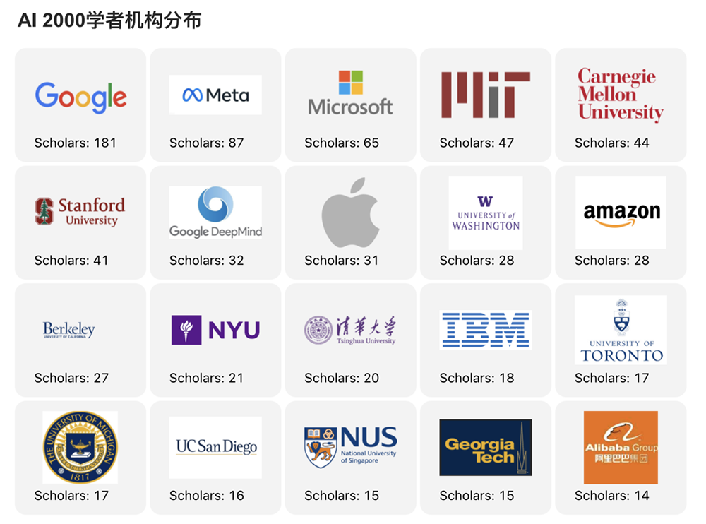 其中位居首位的谷歌公司,共181人次入選榜單,也是唯一一家學者數(shù)過百的機構。