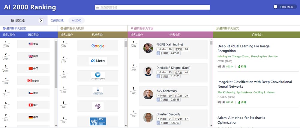 人工智能全球最具影響力學者榜單(簡稱“AI 2000”),由清華大學計算機系AMiner團隊聯(lián)合智譜AI、清華-中國工程科技知識中心知識智能聯(lián)合研究中心共同發(fā)布,旨在通過AMiner學術數(shù)據(jù),在全球范圍內遴選過去十年人工智能(AI)學科最有影響力、最具活力的頂級學者。