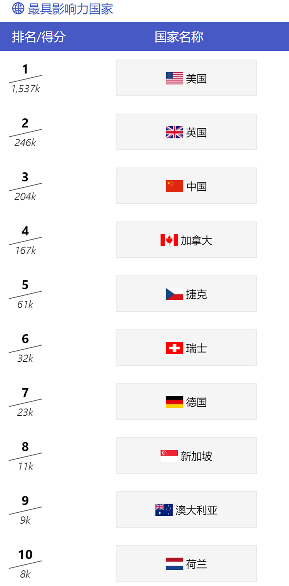 在最具影響力國家的排名中,美國依舊以絕對優(yōu)勢領先,評分遠超于第二名的英國。中國以相對微弱的差距排名第三,緊隨其后的是加拿大。