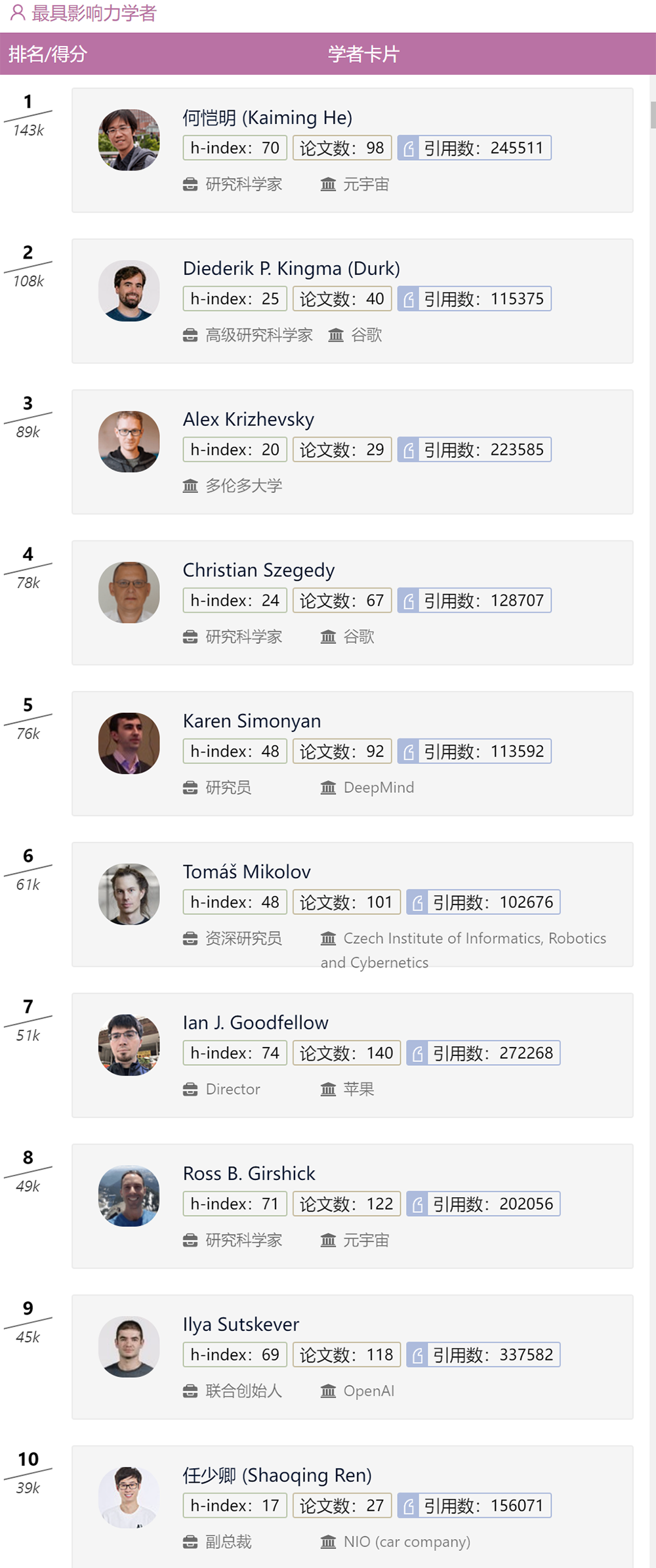 在綜合排名前十的學者中,排名第一的學者是何愷明,任職于Meta(原Facebook);排名第十的學者是任少卿,任職于NIO。