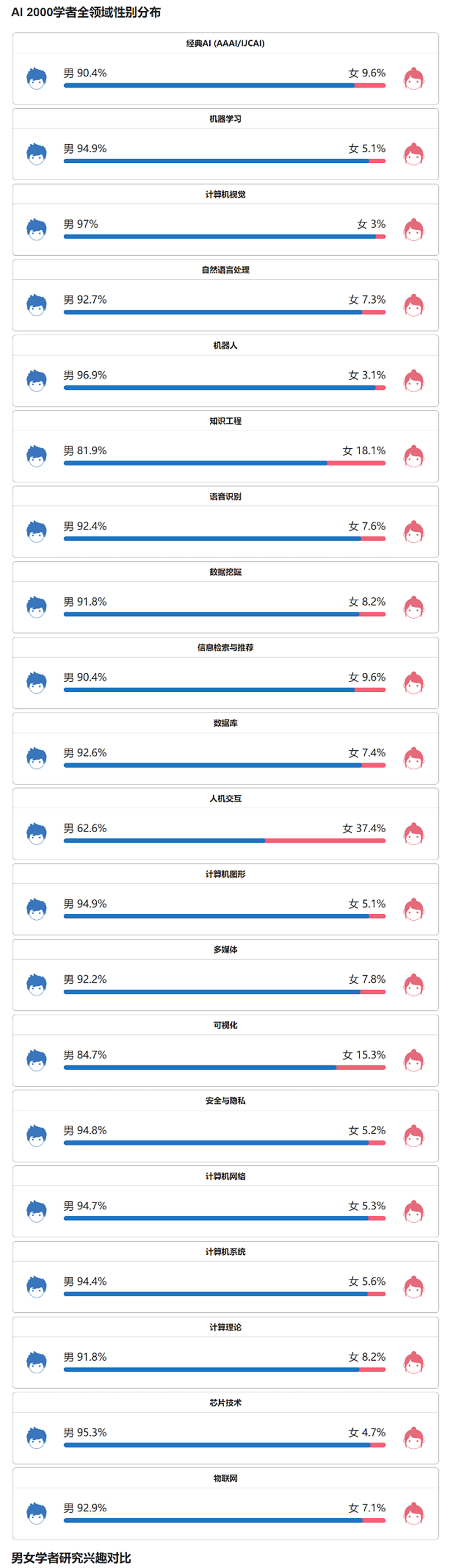 具體而言,男性學者在AI各領域中均占多數(shù),女性學者占少數(shù)。