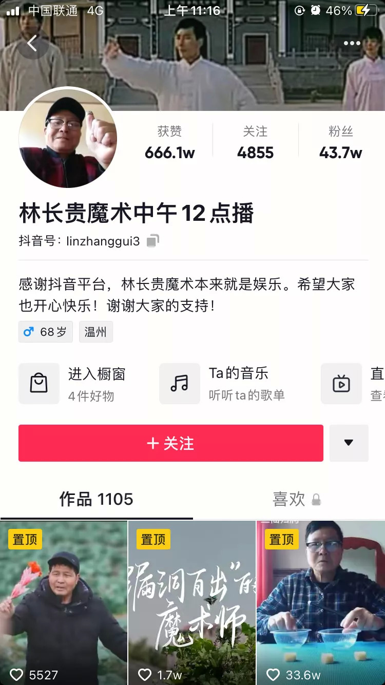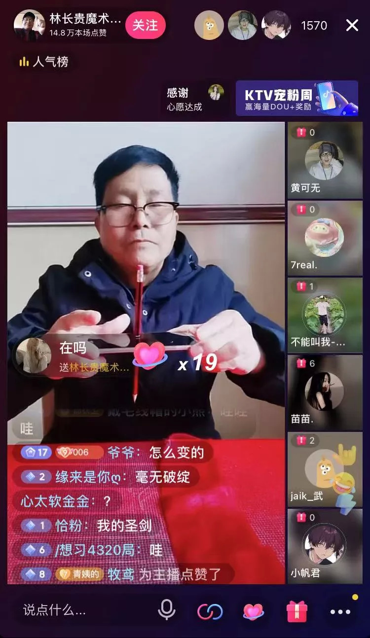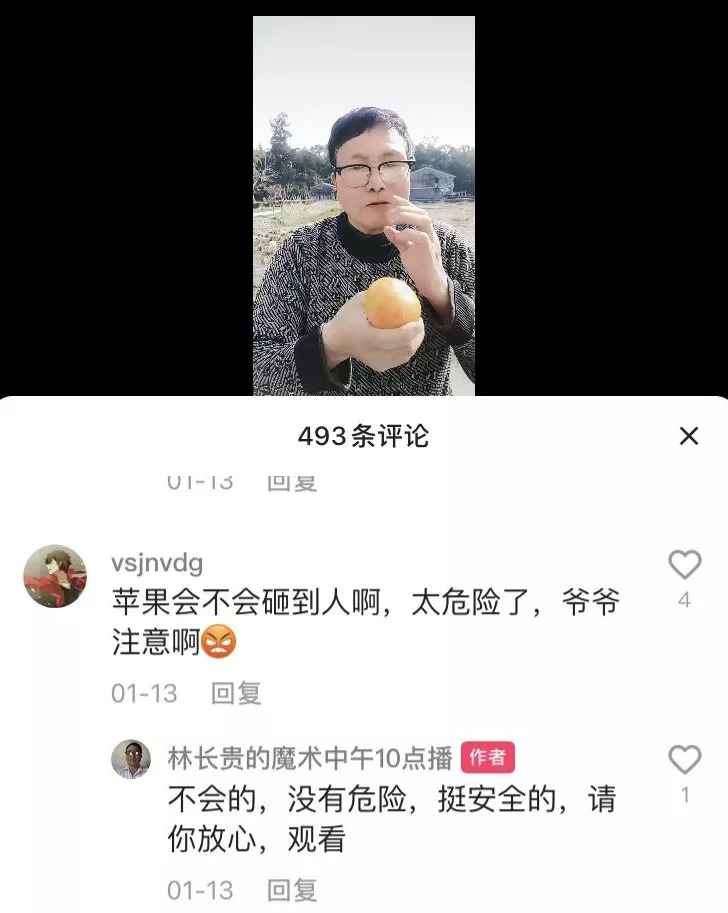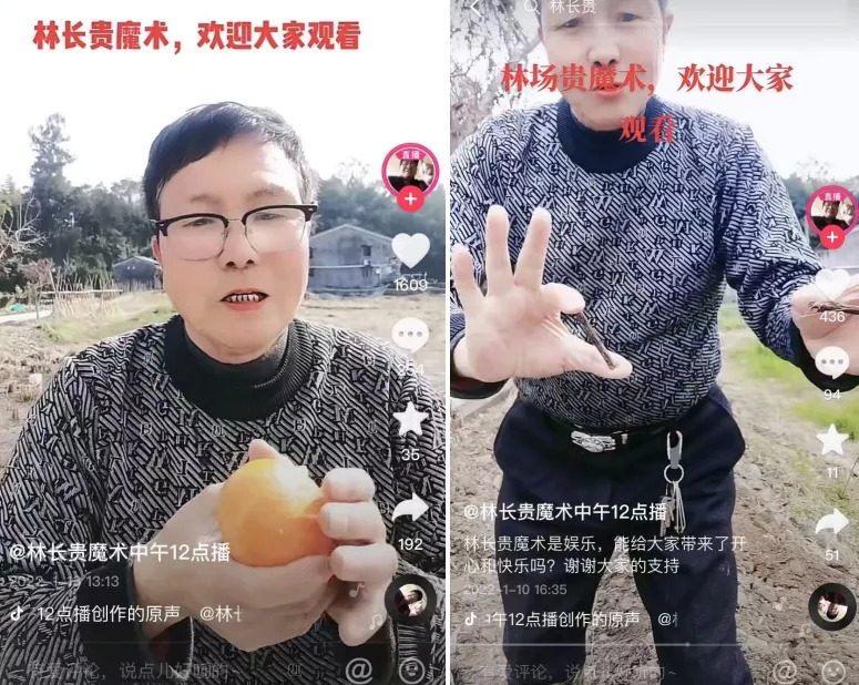 魔術(shù)圈流傳最廣的薩斯頓三原則,幾乎被林長(zhǎng)貴一一擊破,他的魔術(shù)更像是老人的絮叨,“不斷重復(fù)”就是他最津津有味的地方。在每天中午12點(diǎn)(快手是10點(diǎn))的直播里,他可以重復(fù)數(shù)十次“蘋果變橘子”“橘子變蘋果”,然后附贈(zèng)一段吉祥話“變一個(gè)蘋果,祝大家平平安安”,是經(jīng)典的民間藝人討口彩路子。