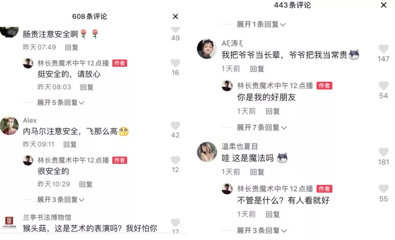 “揭穿魔術(shù)套路”是最不討喜的行為,“給予名不副實(shí)的評(píng)價(jià)”備受青睞,包括且不限于“春晚沒(méi)你我不看”“長(zhǎng)貴這孩子打小就聰明”“哇,這是魔法嗎”——畢竟林長(zhǎng)貴“看不出來(lái)”,還會(huì)認(rèn)真回復(fù)所有帶有“黑稱”的“謬贊”,話術(shù)質(zhì)樸,表示“我(這個(gè)魔術(shù))不危險(xiǎn),謝謝關(guān)心”“魔術(shù)是假的,但是讓人快樂(lè)是真的”——逗悶子的效果就被直接拉滿。