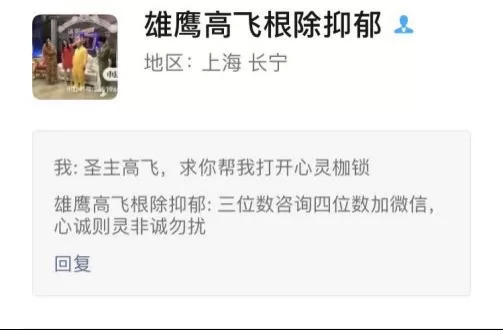 我曾經(jīng)試圖加入這個(gè)以供養(yǎng)(發(fā)紅包)為主的信徒群,據(jù)說(shuō)群公告里面“紅包必須超過(guò)一塊”是最被堅(jiān)決執(zhí)行的群規(guī)。后來(lái)事實(shí)證明確有其事,在我發(fā)出好友申請(qǐng)后,高飛很快回復(fù)我“三位數(shù)咨詢四位數(shù)加微信”,瞬間讓我根除了抑郁。