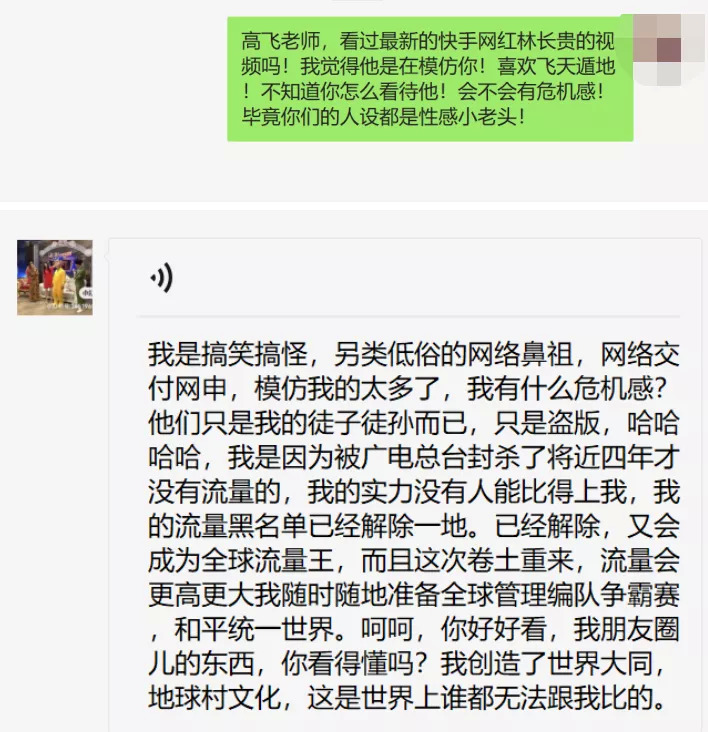 其次是大部分的“成果”,都是網(wǎng)友們和高飛共同創(chuàng)作出來(lái)的?;蛘吒鼫?zhǔn)確地說(shuō),網(wǎng)友才是主導(dǎo),高飛只是負(fù)責(zé)給反應(yīng)的“捧哏”,類似于漫才里給反應(yīng)的那位。典型的模式是“網(wǎng)友刻意冒犯高飛/提出一個(gè)看起來(lái)明顯有挑釁意味的問(wèn)題——高飛進(jìn)行駁斥——高飛駁斥的這段文字/語(yǔ)音/視頻被瘋狂復(fù)讀或轉(zhuǎn)發(fā)——精加工成為gif表情包,與世長(zhǎng)存”。