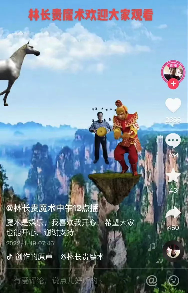 直到他遇到了短視頻和智能手機(jī)。前者給他提供了舞臺(tái),后者成了他的“人參果”,吃一口就能增長(zhǎng)數(shù)十年的修為。