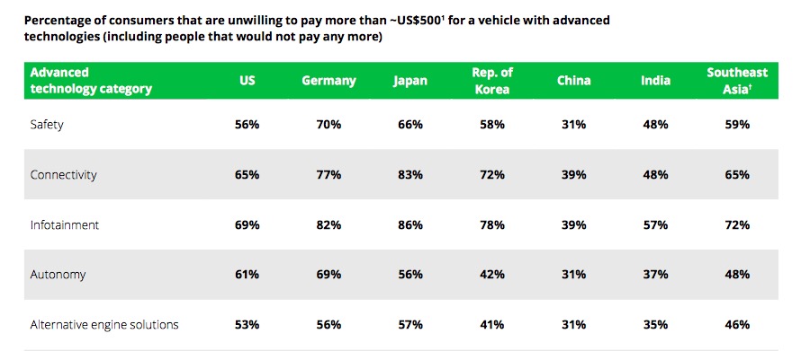 另外,從數(shù)據(jù)中可以看出,德國(guó)消費(fèi)者最“不注重”安全性配置。有70%的受訪者不愿為安全性技術(shù)花費(fèi)超過500美元。不僅如此,德國(guó)消費(fèi)者對(duì)自動(dòng)駕駛技術(shù)也“不感冒”,有69%的受訪者不愿為這類技術(shù)額外花費(fèi)超過500美元。