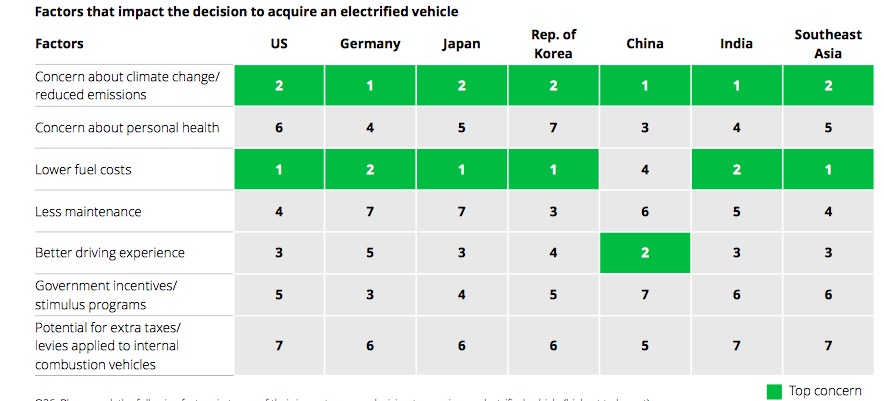 報(bào)告指出,世界各國(guó)汽車市場(chǎng)的消費(fèi)者幾乎都將“減排和環(huán)境因素”作為他們購(gòu)買電動(dòng)化車輛的“首要”或“第二重要”的因素。