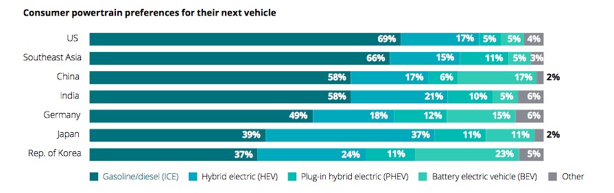 在“下一輛車購(gòu)買哪種動(dòng)力類型車”的調(diào)查中,該報(bào)告得出結(jié)論“韓國(guó)、中國(guó)、德國(guó)”選擇下一輛車為純電動(dòng)車的比例最高,分別達(dá)到23%、17%和15%。
