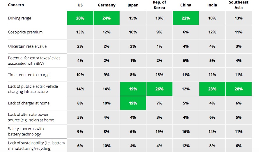 報(bào)告指出,中國(guó)、德國(guó)、美國(guó)都有超過20%的受訪者認(rèn)為“續(xù)航里程焦慮”是最大因素。日本、韓國(guó)、印度消費(fèi)者認(rèn)為“充電基礎(chǔ)設(shè)施缺乏”是阻礙純電動(dòng)車購(gòu)買的最大因素。