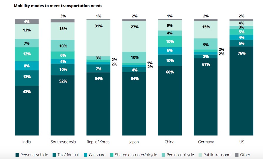 而在出行方式方面,調(diào)查顯示,私家車出行仍然是首選的交通方式。美國(guó)、德國(guó)私家車型意愿最高,分別達(dá)到76%和67%。而日本和韓國(guó)雖然也有54%的受訪者表示首選私家車出行,但同時(shí)這兩個(gè)國(guó)家也是公共交通出行意愿最高的,分別達(dá)到27%和31%。相比之下,美國(guó)只有4%的人會(huì)選擇公共交通。