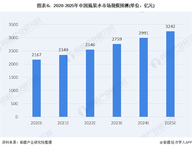 根據(jù)觀研天下整理的數(shù)據(jù)顯示,我國瓶裝水市場規(guī)模近年來持續(xù)提升,從2014年的1237億元增長至2019年的1999億元,年均復合增長率達到10.07%。前瞻產(chǎn)業(yè)研究院預計,未來幾年中國瓶裝水市場規(guī)模將以8%-9%的增速增長,2025年市場規(guī)模有望突破3000億元。