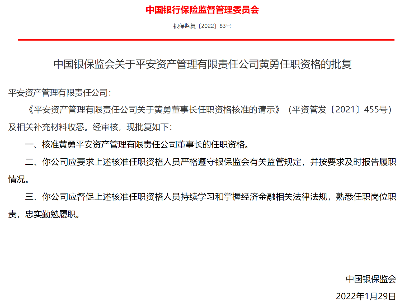 2月7日,中國銀保監(jiān)會發(fā)布批復公告,核準黃勇平安資產(chǎn)管理有限責任公司(簡稱“平安資管”)董事長的任職資格,批復時間2022年1月29日。