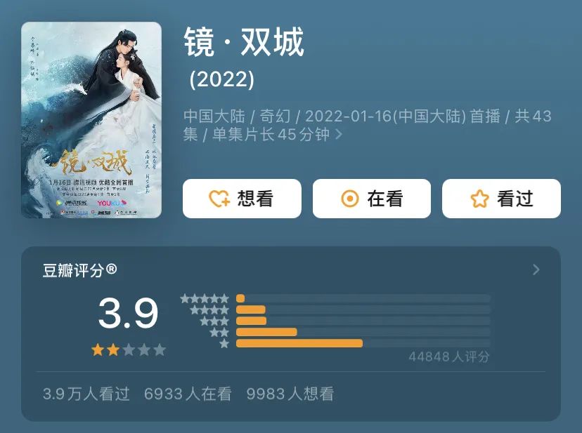 或也是意識到了上述兩點,騰訊視頻才會將《鏡·雙城》的播出權(quán)分給了優(yōu)酷。但值得注意的是,預(yù)排播今年上線的《玉骨遙》也改編自“鏡”系列。