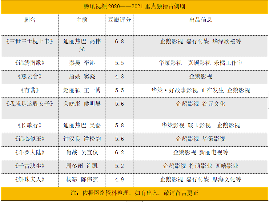 據(jù)文娛君梳理,2020至2021這兩年期間,騰訊視頻重點獨播的10古偶劇中僅有《三生三世枕上書》《斗羅大陸》兩部的豆瓣口碑達(dá)到了及格線以上。