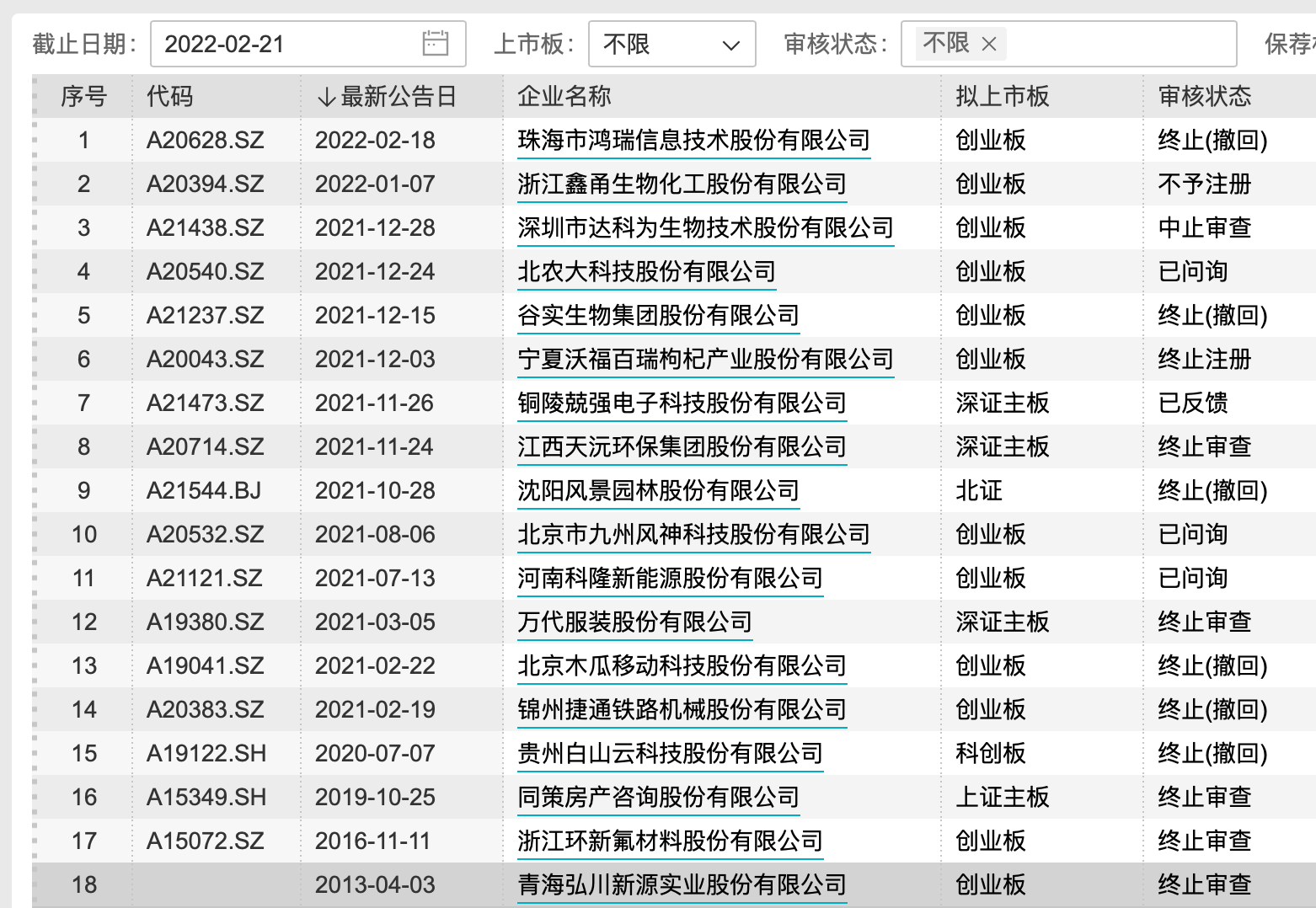 中天國富現(xiàn)有18個存量IPO項目,絕大多數(shù)已擱淺。Wind數(shù)據(jù)顯示,僅2021年,中天國富保薦的8家公司中斷了申請上市進程,其中鑫甬生物為不予注冊;谷實生物、沈陽風(fēng)景、木瓜移動、錦州捷通等4家公司終止(撤回);深圳達(dá)科為中止審查;萬代服裝、天沅環(huán)保終止審查。