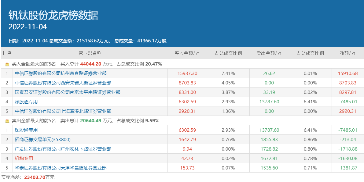 值得一提的是,11月4日,除了方新俠與作手新一之外,另一個知名游資常用席位中信證券上海漕溪北路也出現(xiàn)在釩鈦股份買方前五位中,買入金額為2920.31萬元。