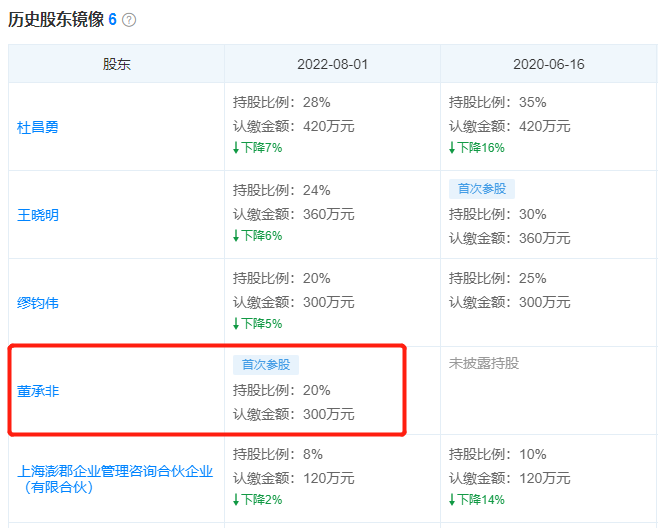 天眼查APP數(shù)據(jù)顯示,8月1日,董承非所在的百億私募??べY產(chǎn)更新了一條股東變更信息,其中,董承非認繳300萬元正式晉升為公司第三大股東,持股比例為20%,公司原有的杜昌勇、王曉明、繆鈞偉、上海澎郡企業(yè)管理咨詢合伙企業(yè)(有限合伙)等多位股東的持股比例均隨之有所下降,最新的持股比例依次分別為28%、24%、20%和8%。