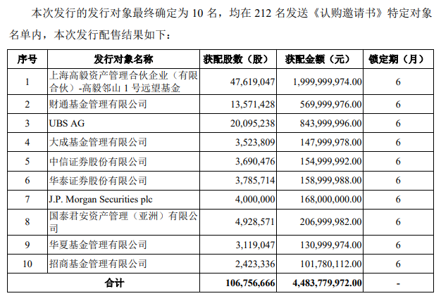 此外,財通基金、USB AG、大成基金、中信證券、華泰證券、J.P. Morgan Securities plc 、國泰君安資產(chǎn)管理(亞洲)、華夏基金、招商基金等海內(nèi)外知名金融機構(gòu)也都榜上有名,獲配金額介入1.02億元-5.7億元之間不等。