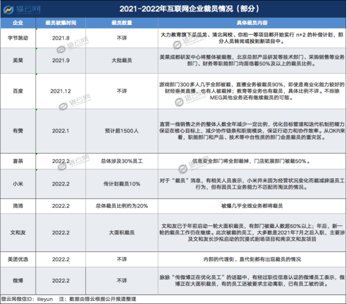 短短兩個月以來,叮咚買菜、有贊、喜茶、小米、滴滴、拼多多、文和友、知乎、美團優(yōu)選、微博等企業(yè)均被爆出進行“優(yōu)化”工作,成為了繼2021年字節(jié)跳動、快手、愛奇藝、百度等超35家互聯(lián)網(wǎng)企業(yè)裁員、縮編的序曲。