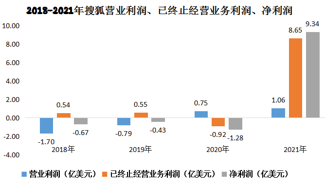 值得一提的是,2021年,搜狐搜狐凈利潤為9.34億美元,自2018年以來首次扭虧為盈。其中,有8.65億利潤來自出售搜狗等持股公司股份,但營業(yè)利潤為1.06億美元,同比增長41%。