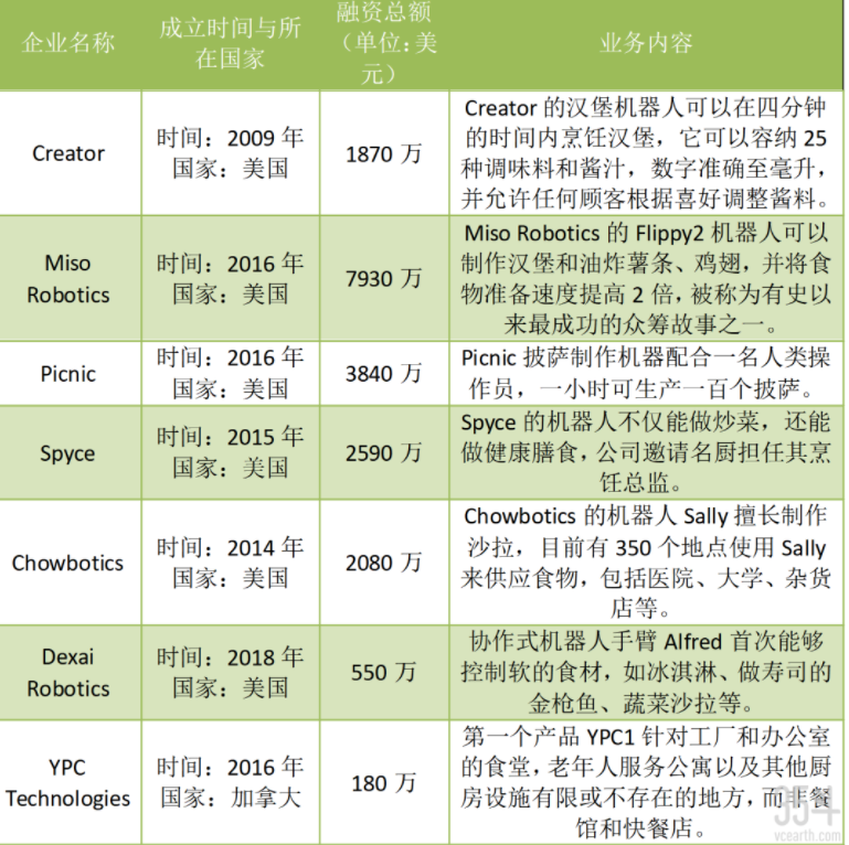 表2:機(jī)器制餐領(lǐng)域公司(部分) 數(shù)據(jù)來源:crunchbase、公司官網(wǎng)