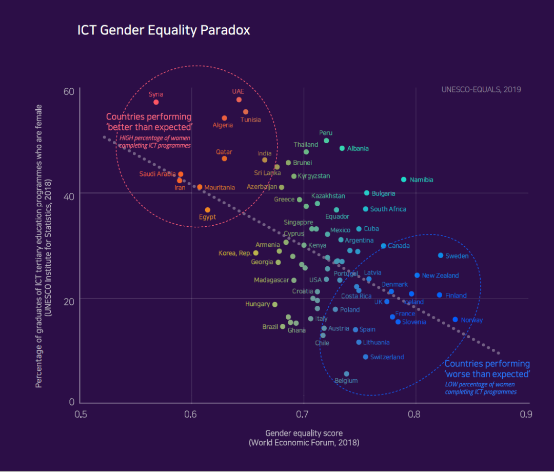 既然無(wú)法從根本上回避性別,那么增加ICT領(lǐng)域的女性從業(yè)數(shù)量,尤其是鼓勵(lì)更多女性投身AI開(kāi)發(fā),才能從源頭上既賦予AI以溫度,同時(shí)避免偏見(jiàn)。