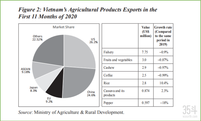 目前,美國是越南最大的農(nóng)產(chǎn)品出口市場,2020年前11個(gè)月占越南農(nóng)業(yè)出口總收入的26.2%。其次是中國,為24.6%。