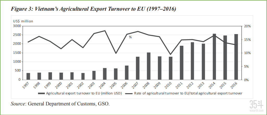 然而,由于歐盟對(duì)高質(zhì)量的要求,向歐盟出口是一項(xiàng)挑戰(zhàn),這可能是越南出口商面臨的一大障礙。因此,對(duì)越南來說,正確評(píng)估其當(dāng)前的生產(chǎn)模式并找到正確的農(nóng)業(yè)生產(chǎn)戰(zhàn)略,以促進(jìn)其出口到歐盟市場是非常重要的。自1995年歐共體與越南簽署《合作協(xié)議》以來,越南從歐盟市場的農(nóng)產(chǎn)品出口總額從1999年的3.62億美元飆升至2016年的25.9億美元。越南2007年加入世貿(mào)組織后,這一數(shù)字翻了一番(2005年為5.847億美元,2007年為12.8億美元)。
