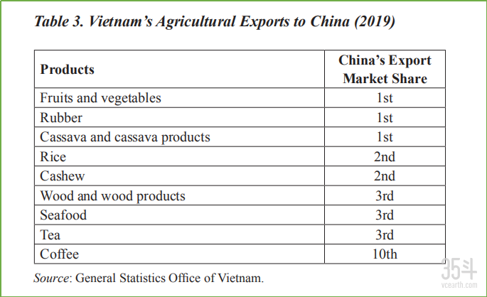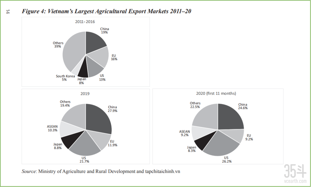 從2011年到2016年,越南對(duì)中國的農(nóng)產(chǎn)品出口年均增長12.7%,在此期間,中國還是越南農(nóng)產(chǎn)品的最大進(jìn)口國(19%),到2019年,越南的這一市場份額將擴(kuò)大到27.9%。然而,在2020年,中國被美國超越。中國目前是越南農(nóng)產(chǎn)品的第二大進(jìn)口國,占越南農(nóng)產(chǎn)品市場份額的24.6%。