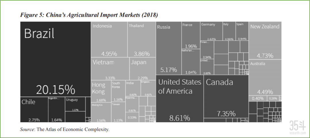 圖5 中國農(nóng)業(yè)主要的農(nóng)業(yè)進(jìn)口市場 數(shù)據(jù)來源:經(jīng)濟(jì)復(fù)雜度報(bào)道