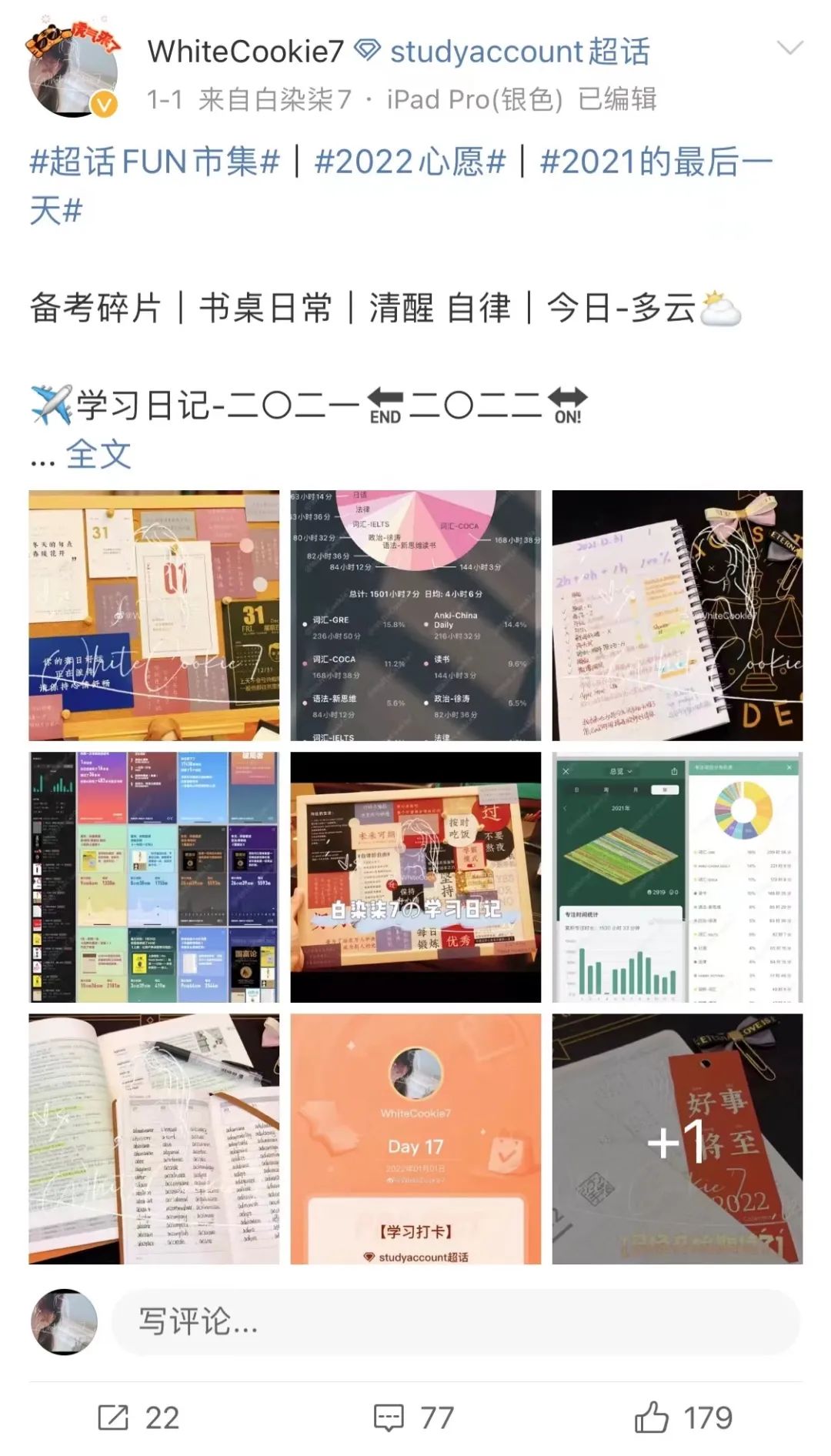 2021 年底考研超話里有了“學習打卡”功能,每日打卡成了她生活的一部分,被記錄下來的也不再僅僅是背了什么書,看了哪些題,有時候就連家里的金魚換了幾次水都成了不會被遺忘的痕跡。