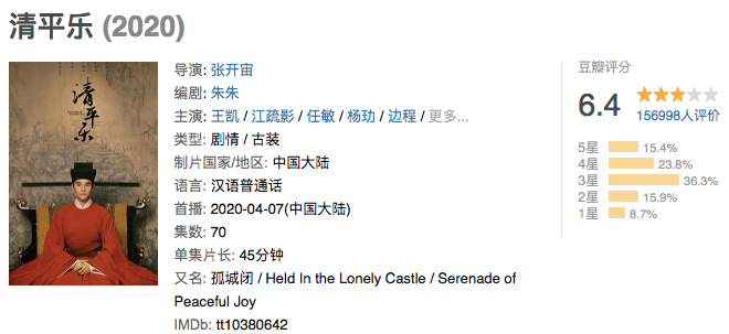從內(nèi)容層面來看,正午陽光頻出精品的同時,也有過爭議作品。譬如上文提到的被網(wǎng)友質(zhì)疑為靠近“熱搜”的幾部作品,以及《歡樂頌2》、張開宙執(zhí)導(dǎo)的《清平樂》等,都曾受到過部分指責(zé),但從作品整體輸出來看,即便是偶有爭議的作品,也都在豆瓣7分左右——中等制作水平無疑是“保住”的。只是同比正午還屬于山影時期所打造的《父母愛情》《北平無戰(zhàn)事》等9分佳作,還略有出入。