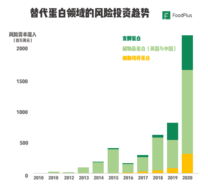 2020年,細胞培養(yǎng)蛋白領(lǐng)域的投融資金額實現(xiàn)了近400%的增長,總金額超過了4億美元,這個增速遠超植物基蛋白和發(fā)酵蛋白領(lǐng)域。