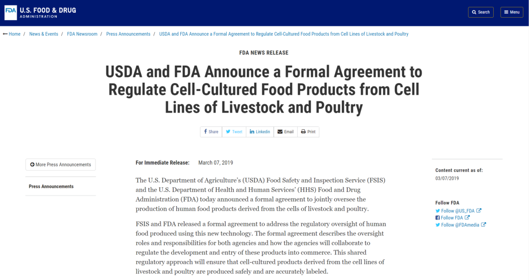 美國的細胞培養(yǎng)肉監(jiān)管推進步伐已經(jīng)遠超其以往對新食品的監(jiān)管推動速度。在2019年3月,美國的兩大食品安全監(jiān)管部門FDA(美國食品藥品監(jiān)督管理局)與USDA(美國農(nóng)業(yè)部)宣布了雙方會共同監(jiān)管美國的細胞培養(yǎng)肉行業(yè)。那之后,F(xiàn)DA已經(jīng)推出了細胞培養(yǎng)海鮮申請需要的材料的清單(海鮮不歸USDA管,所以推動進度會比細胞培養(yǎng)肉更快)并為申請者進行輔導,USDA相關(guān)發(fā)言人表示他們也非常接近推出類似的清單。