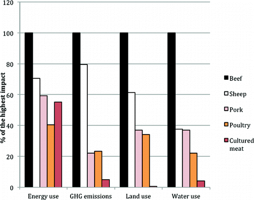 細胞培養(yǎng)肉技術(shù)與傳統(tǒng)養(yǎng)殖生產(chǎn)肉類方法資源使用的對比,來源:Environmental Impacts of Cultured Meat Production