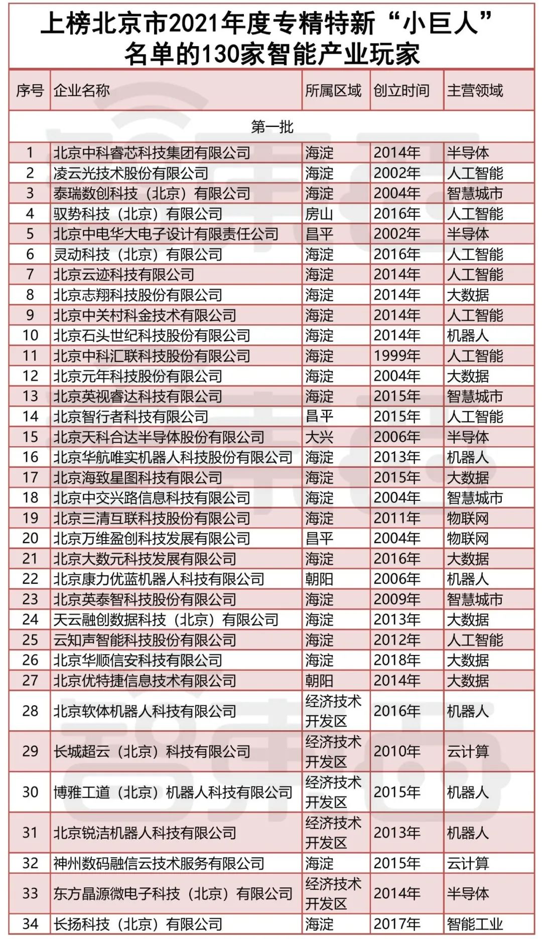 智東西3月4日?qǐng)?bào)道,本周,北京經(jīng)信局公布了第二批2021年度專(zhuān)精特新“小巨人”名單。結(jié)合此前公布的第一批名單,我們發(fā)現(xiàn)在1036家上榜企業(yè)中,有大約130家企業(yè)分布在智能產(chǎn)業(yè)。這些智能產(chǎn)業(yè)“小巨頭”,代表了當(dāng)下中國(guó)部分最前沿的智能“硬科技”實(shí)力。